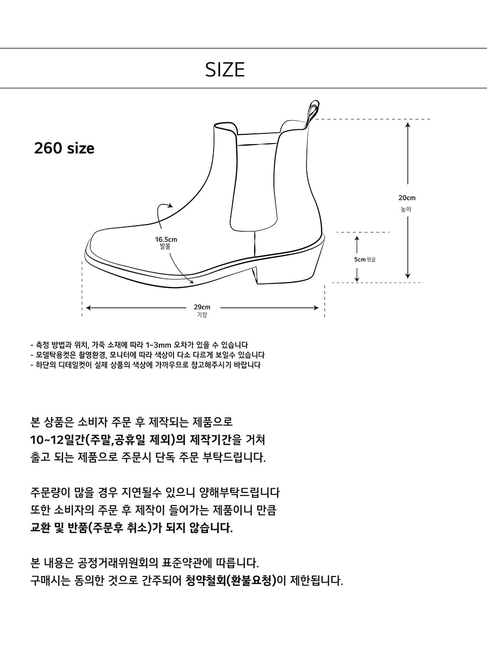 NOTICE - 오더메이드 방식으로 제작기간 평일기준 7-10일정도 소요되며 공장의 일정에 따라 변동이 발생 될 수 있습니다. - 가죽의 특성상 오염 및 세탁에 주의하세요. - 수령후 착화 흔적이 발생될 경우 교환 또는 환불이 불가할 수 있습니다. - 특수사이즈(285, 290사이즈)는 반품, 교환이 불가합니다.